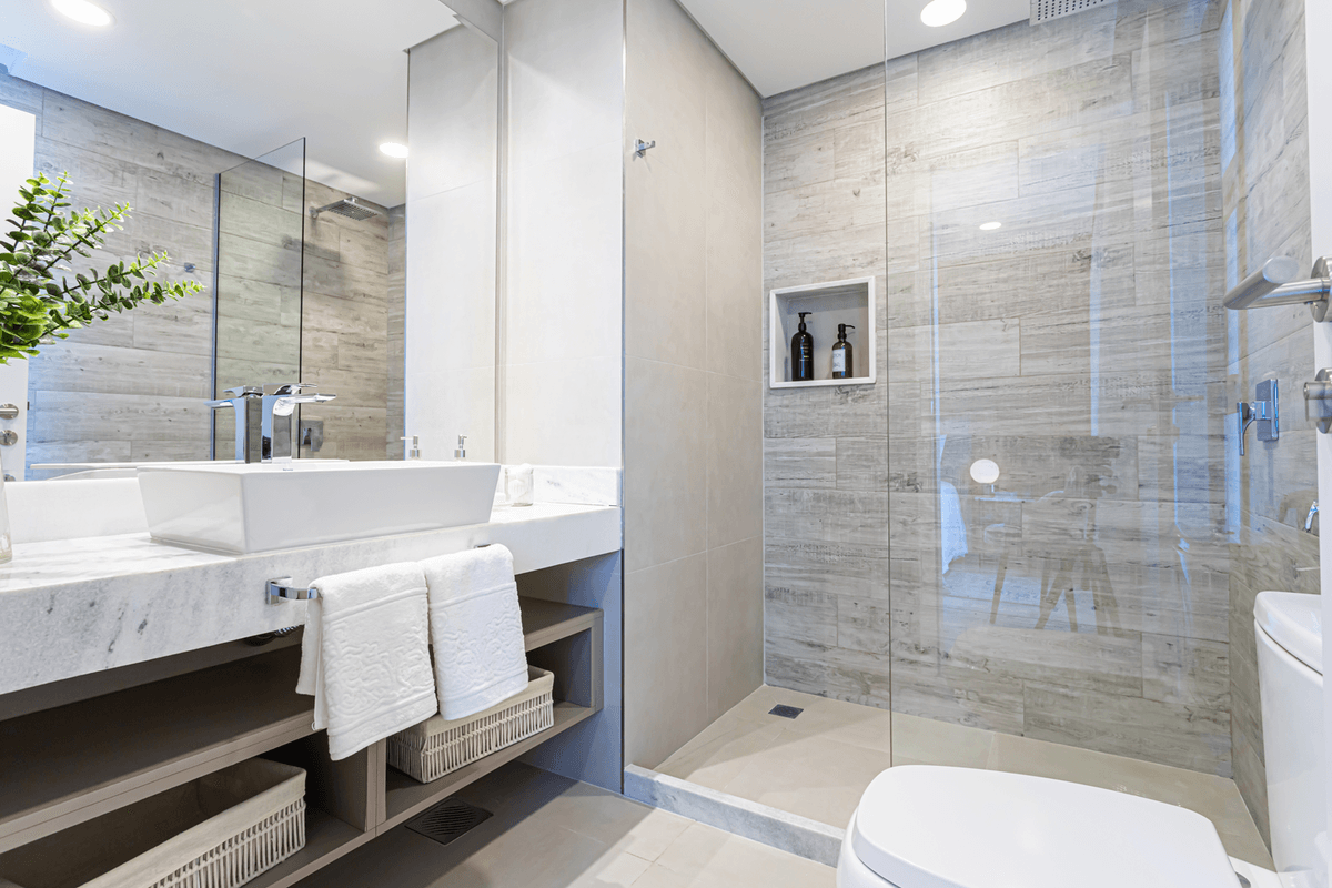 Un spa privado con porcelanato tipo madera, grifería cromada de alta gama y nichos empotrados. Diseñado para el relax absoluto, donde cada detalle emana elegancia y funcionalidad.